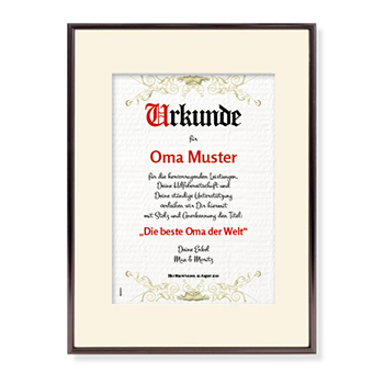 Die Urkunden werden mit einem Rahmen nach Wahl geliefert.