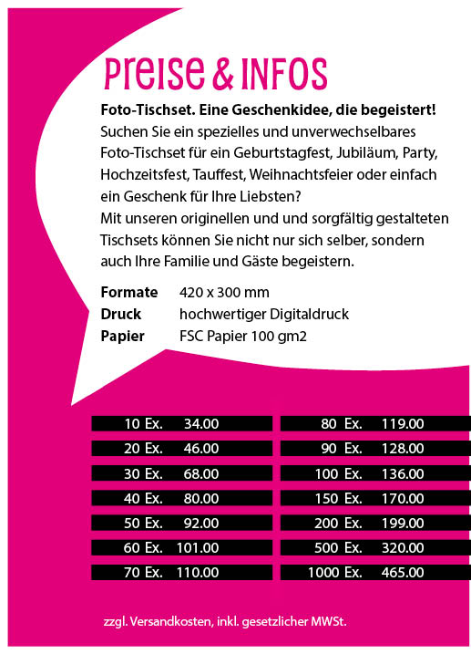 Sie möchten für einen Geburtstag ein Tischset mit vielen Fotos selber gestalten? Oder zum Hochzeitsfest ein Tischset mit Fotos und Namen des Brautpaares auflegen? Oder ein Tischset zur Taufe, zum Weihnachtsfest oder zum Jubiläum? Bei digitprint.ch ist das alles kein Problem! Wir haben die grösste Auswahl an individuell personalisierbaren Tischset-Vorlagen zum selber gestalten. Sie können ganz einfach Ihre Lieblingsbilder online hochladen, den Namen und Text eingeben, und schon ist Ihr ganz persönliches und einmaliges Foto Tischset fertig gestaltet. Mit der revolutionäre High Chroma Toner-Technologie erreicht wir faszinierende Farben von bisher unerreichter Qualität. Jetzt das Tischset nur noch Einrahmen und an die Wand hängen. So geht Kunst! Individuelle Tischsets sind nicht nur ideal, um den Esstisch zu schmücken, sondern auch eine unterhaltsame und einzigartige Art, Ihre schönsten Fotos zu zeigen! Wir bieten Ihnen Dutzende von Vorlagen an, damit Sie die Tischsets Ihrem ganz persönlichen Stil anpassen können. Laden Sie Hochzeitsfotos, Urlaubsfotos oder einige süsse Schnappschüsse von Haustieren hoch. Damit wird Ihr Küchentisch zum Herzstück Ihres Zuhauses!